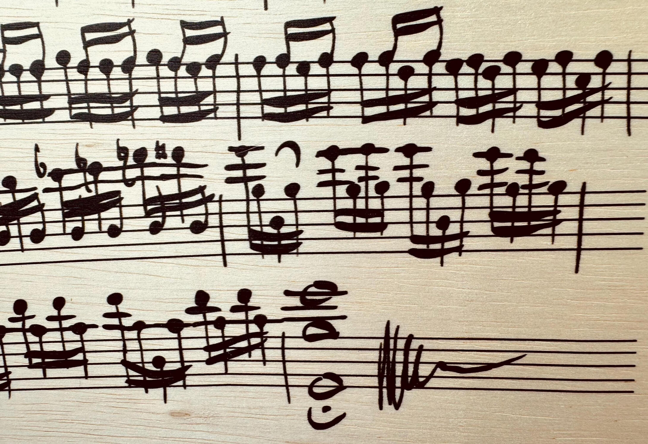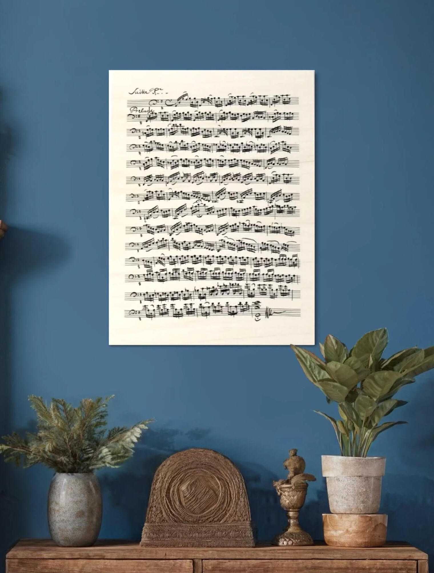 The manuscript is printed directly onto a solid wood panel, allowing the grain to remain visible beneath the music. The result is warm, tactile, and slightly different every time.– Size: 30 × 40 cm